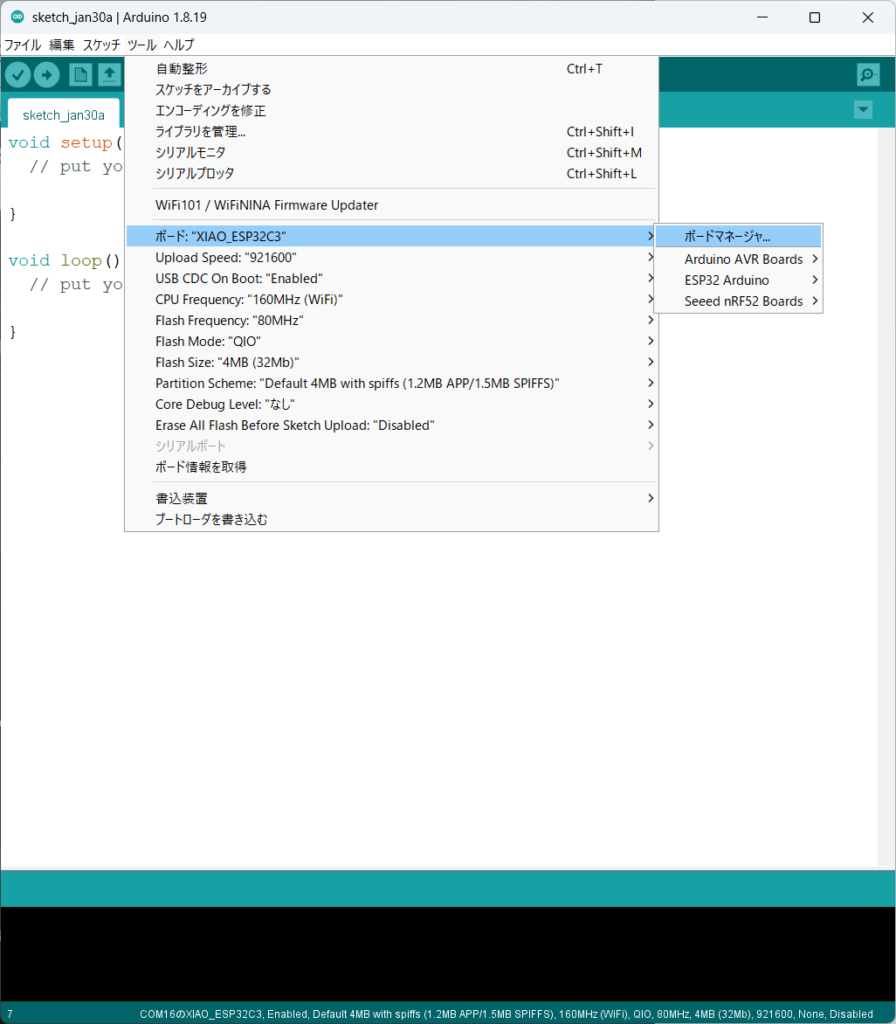 ボードマネージャからXIAOESP32C3を選びます。で,接続されているComを確かめて指定します。で,