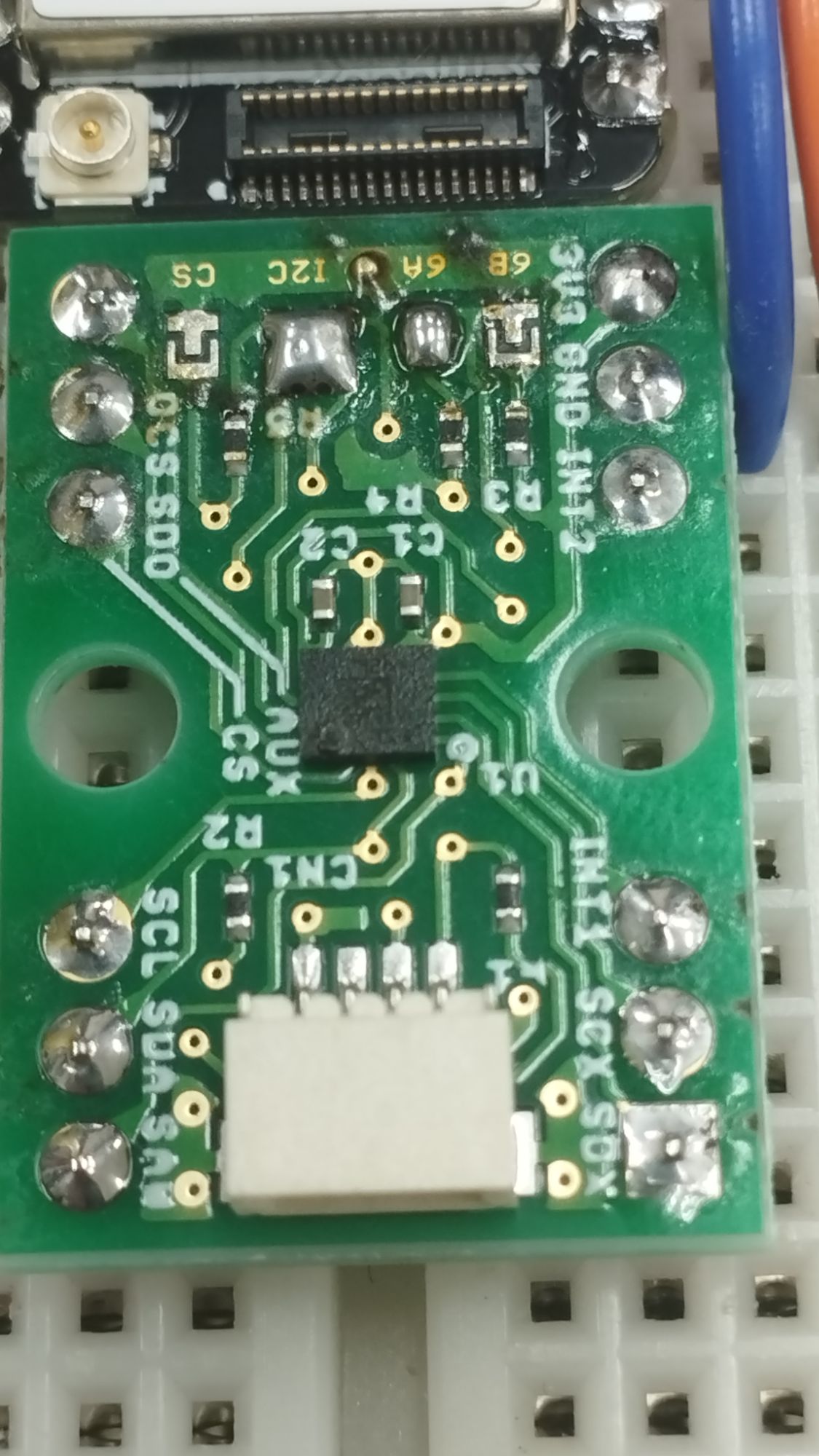 センサーを動かすには二箇所のジャンパー(I2Cと6A。添付右画像の通り)を埋める必要がある。あとは配線。