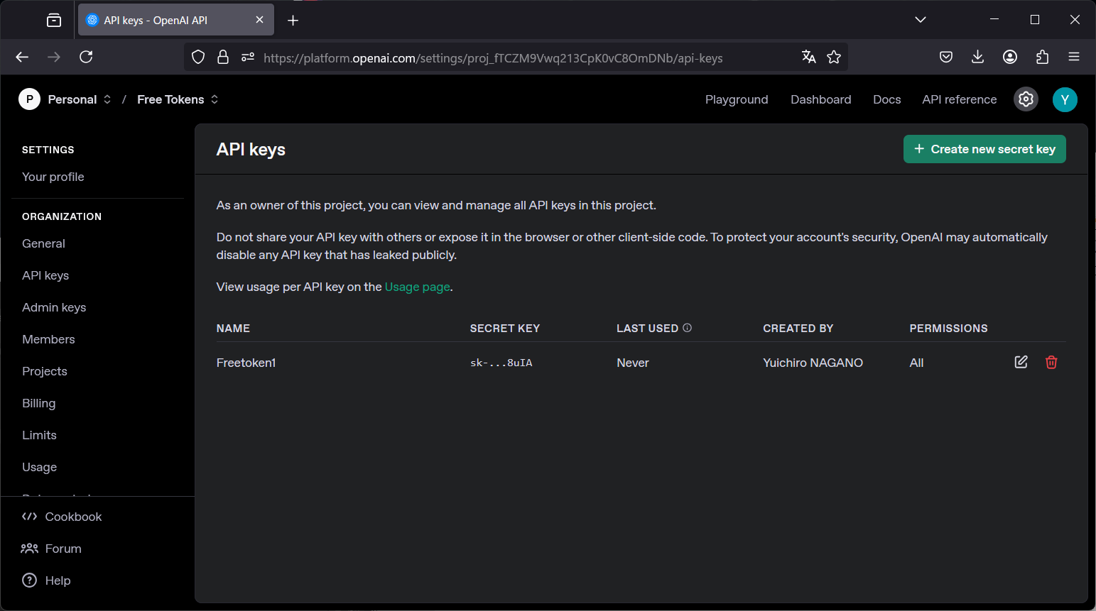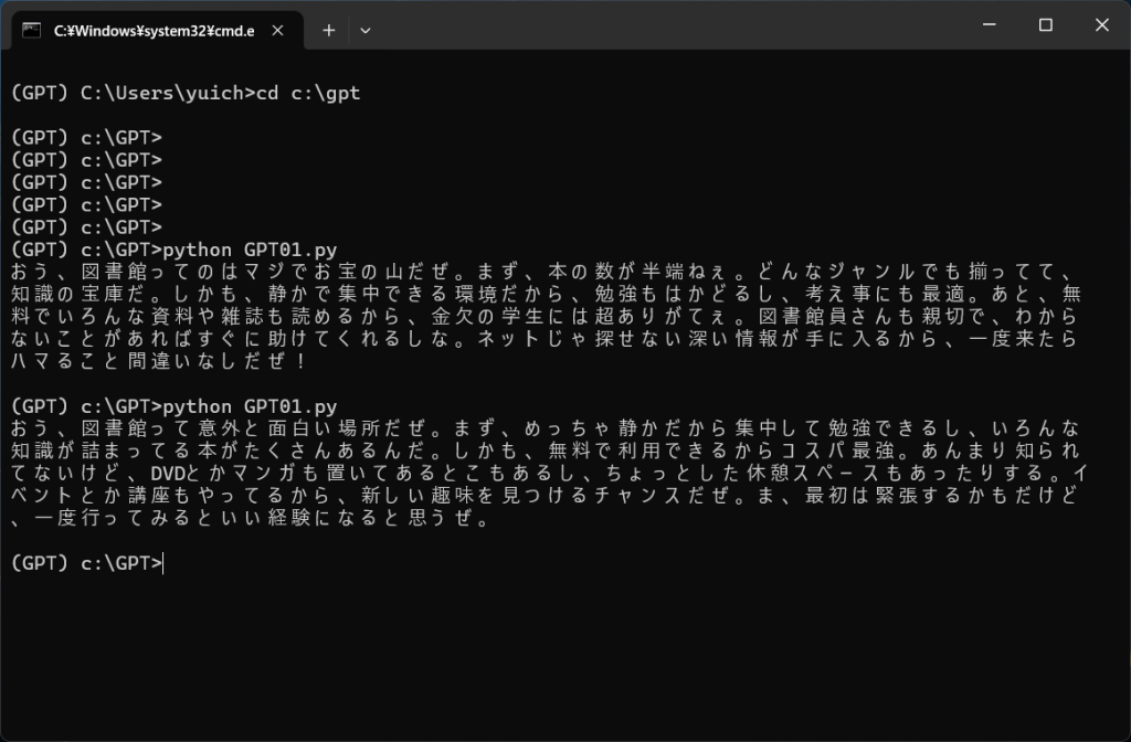 OpenAI API を毎日無料で 100 万トークン使えるらしい?によれば、条件をみたすと100万トークン毎日無料で使えるようになるという。本当に?!ブログに従って無料トークン用のAPIキーを作成してみる。Pythonで試してみようか・・・あ、動きますね!これなら無駄に会話を続けてもダメージは最小限に抑えられる。これで開発しようか。