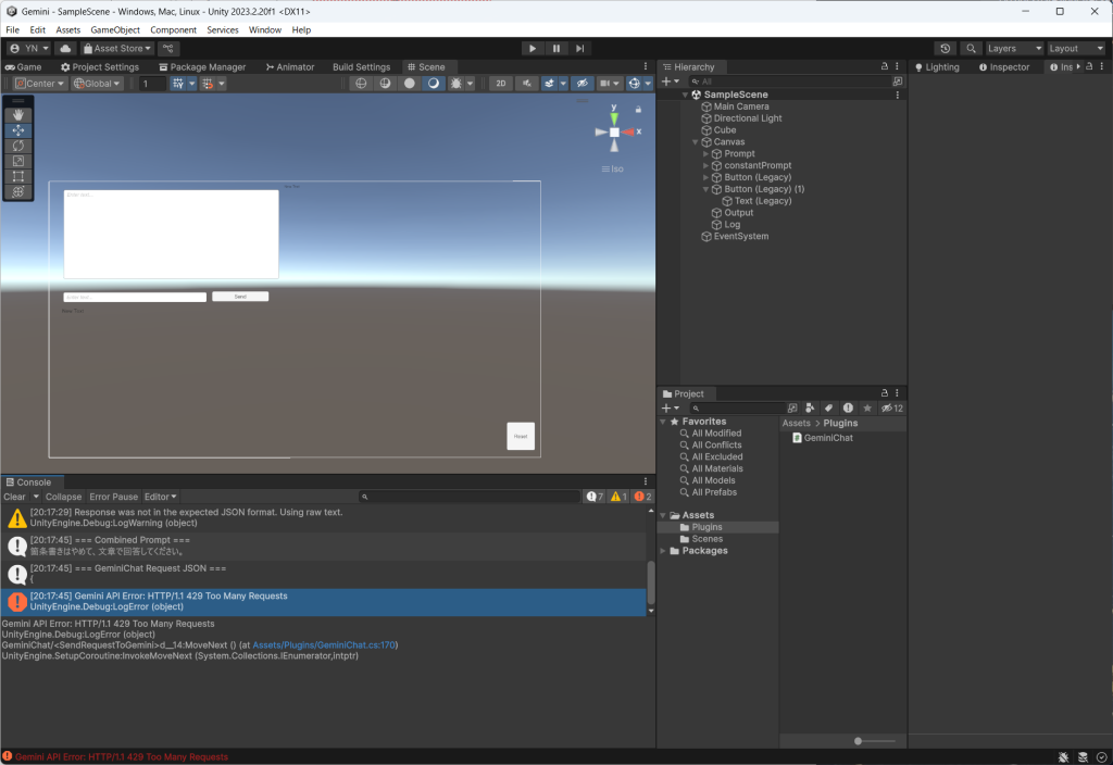 Geminiは、ChatGPTにUnityでの使い方を聞いたらあっさり動作した。・・・がしかし、50リクエスト/日とある。50リクエストしかできないって事じゃ??はぁ~
