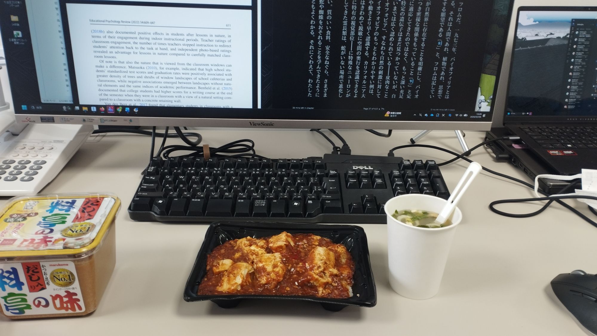 本郷260208 2026/02/08未分類nagano 今日は朝から本郷キャンパスに来た。昼食は360円の麻婆豆腐と自作の味噌汁だ。麻婆豆腐の成分がちょっとヤバそうだが,電子レンジがまだなく調理が出来ず致し方なし・・。電子レンジ調理を前提にまいばすの商品ラインナップをチェックすると,ニンジン,じゃがいも,カレールーも売ってる。健康を目指した自炊・・・出来そうな気がする。