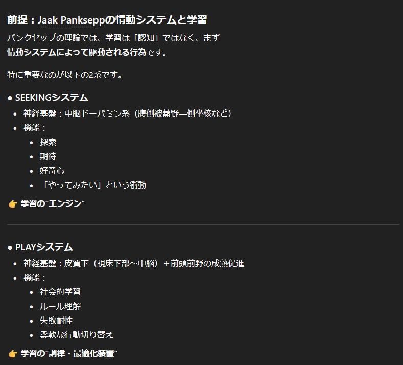 「パンクセップの理論では、学習は「認知」ではなく、まず情動システムによって駆動される行為です。」