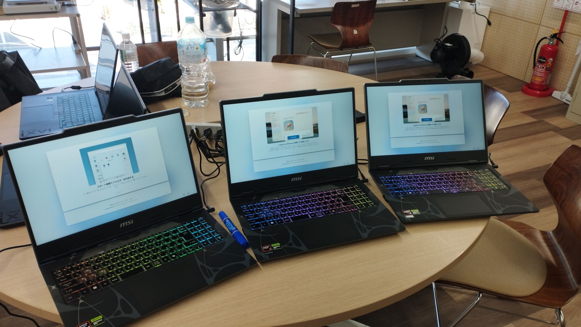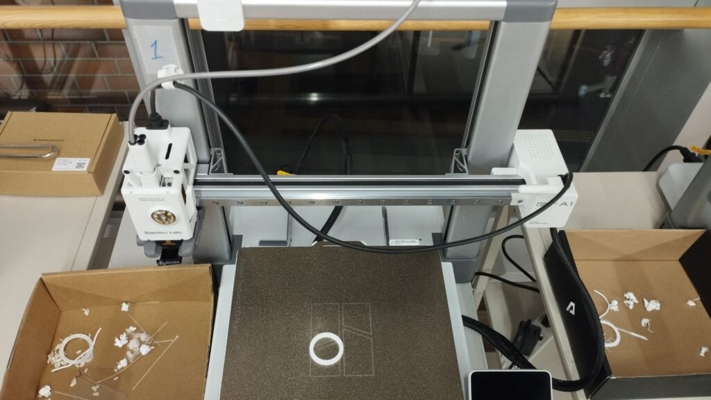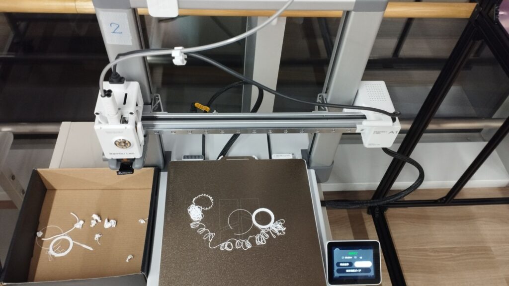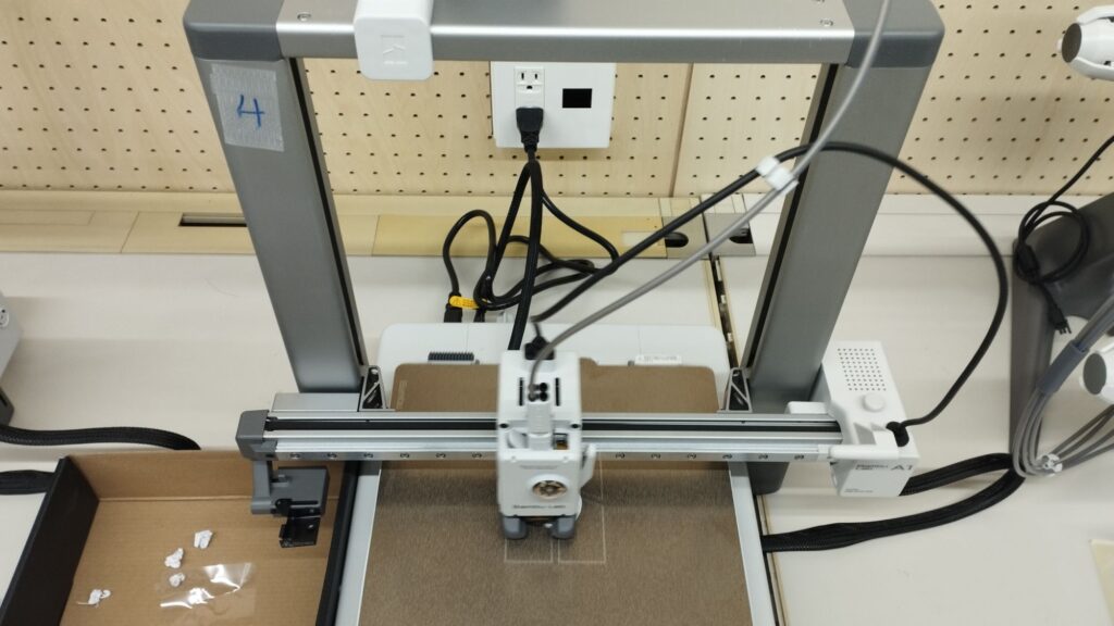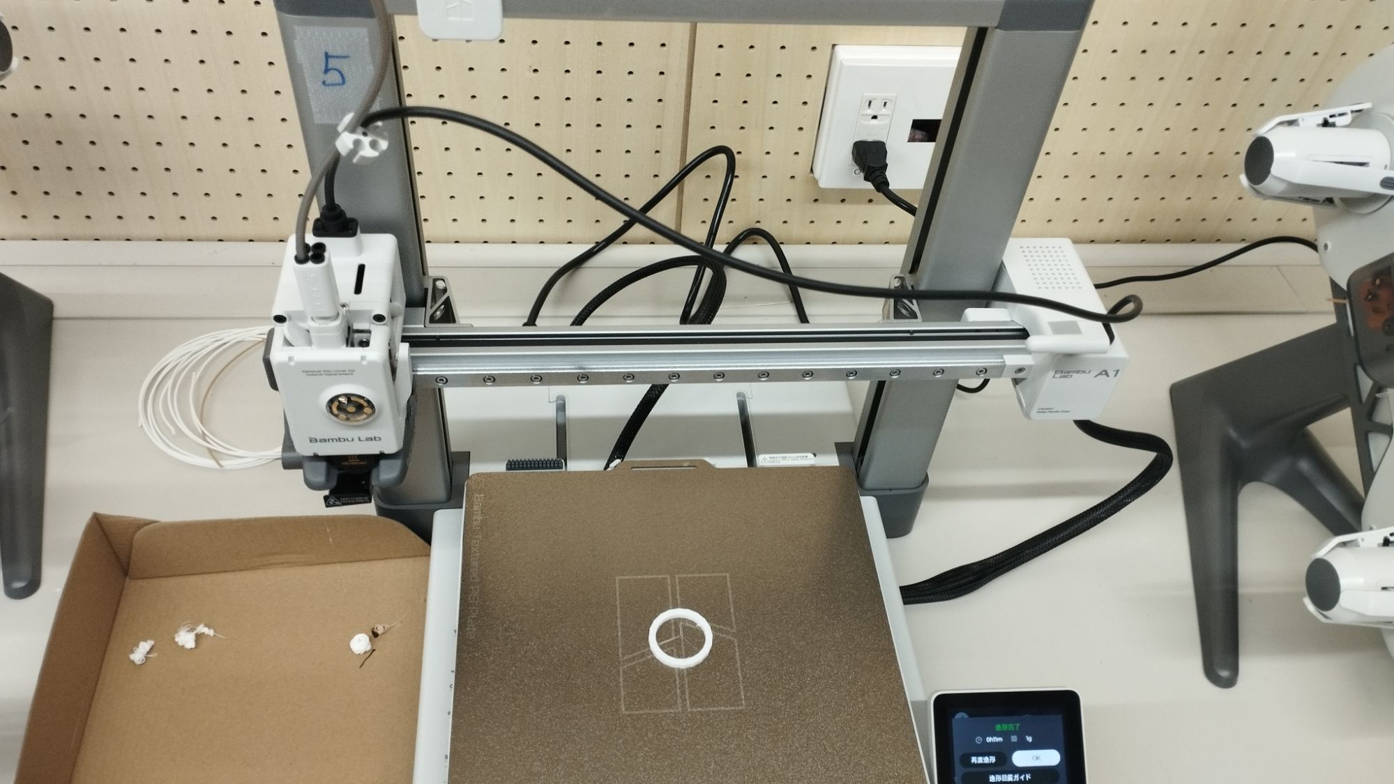 まずは,ものラボ用PCのセットアップから。Ryzen9/RTX5060のPCを3台買ってもらったので,monolab03-05として配備。Chrome,BambuStudioを入れる。速いんだろうけど,まだわからない。そして,ルーターを配備したので,すべてのBambuA1をネットワークに接続。金井さんに届けていただいたフィラメントを配備する。