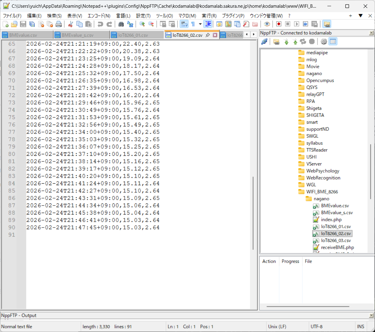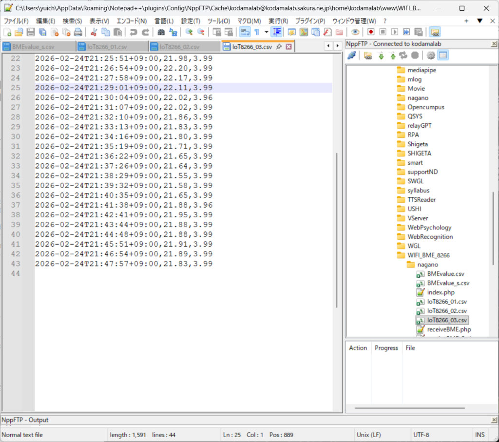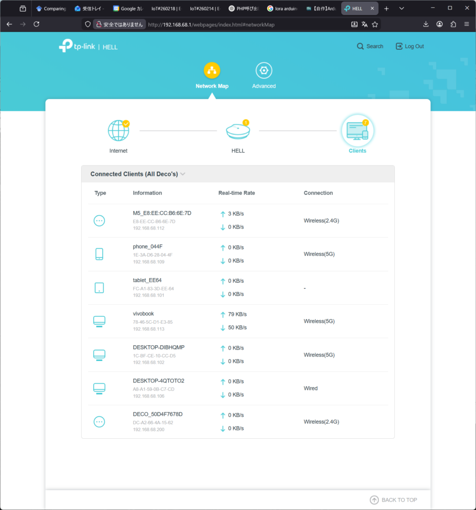 の3機をセットアップした。全機種ともソフトウェア&ハードウェアをアップグレードして,1)電源電圧をモニターできるようになった,2)IP割り振りをDHCPから固定に変えた,3)「IoT8266_01」などの機体名をログに載せられるようになった,などの改善が行われた。あれ?固定IPで接続するとClientのリストに出ないんだね?