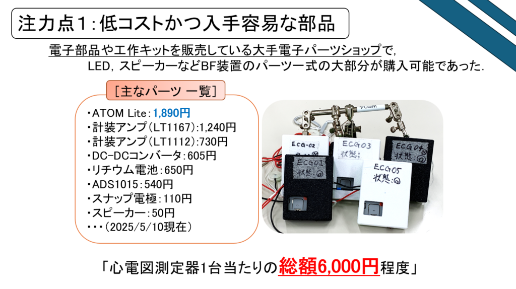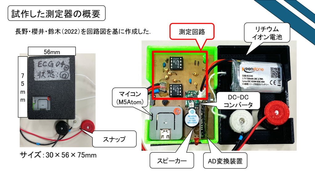 長野他(2022)の心電図アンプを基に開発した.心電図アンプ1台当たりの総額6,000円程度(2025/5/10時点).Pan-Tompkins法によるQRS検出のアルゴリズムを追加したことで計測精度が向上した.さらに,ネックレス式にしたことで,装着性や携帯性,操作性を向上させた.
