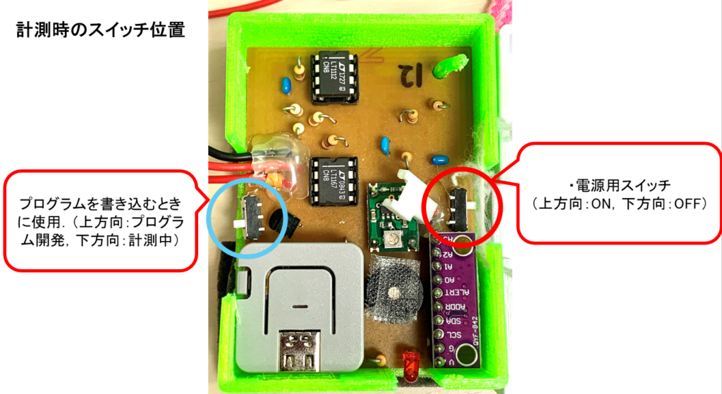 A2.下記画像,左側のスイッチはプログラム開発時のみ使用.マイコン(M5 Atom)はプログラム書き込み時に電流を流すと,書き込めなくなる.右側のスイッチは電源用のスイッチで,基本的にはこれだけ使う.